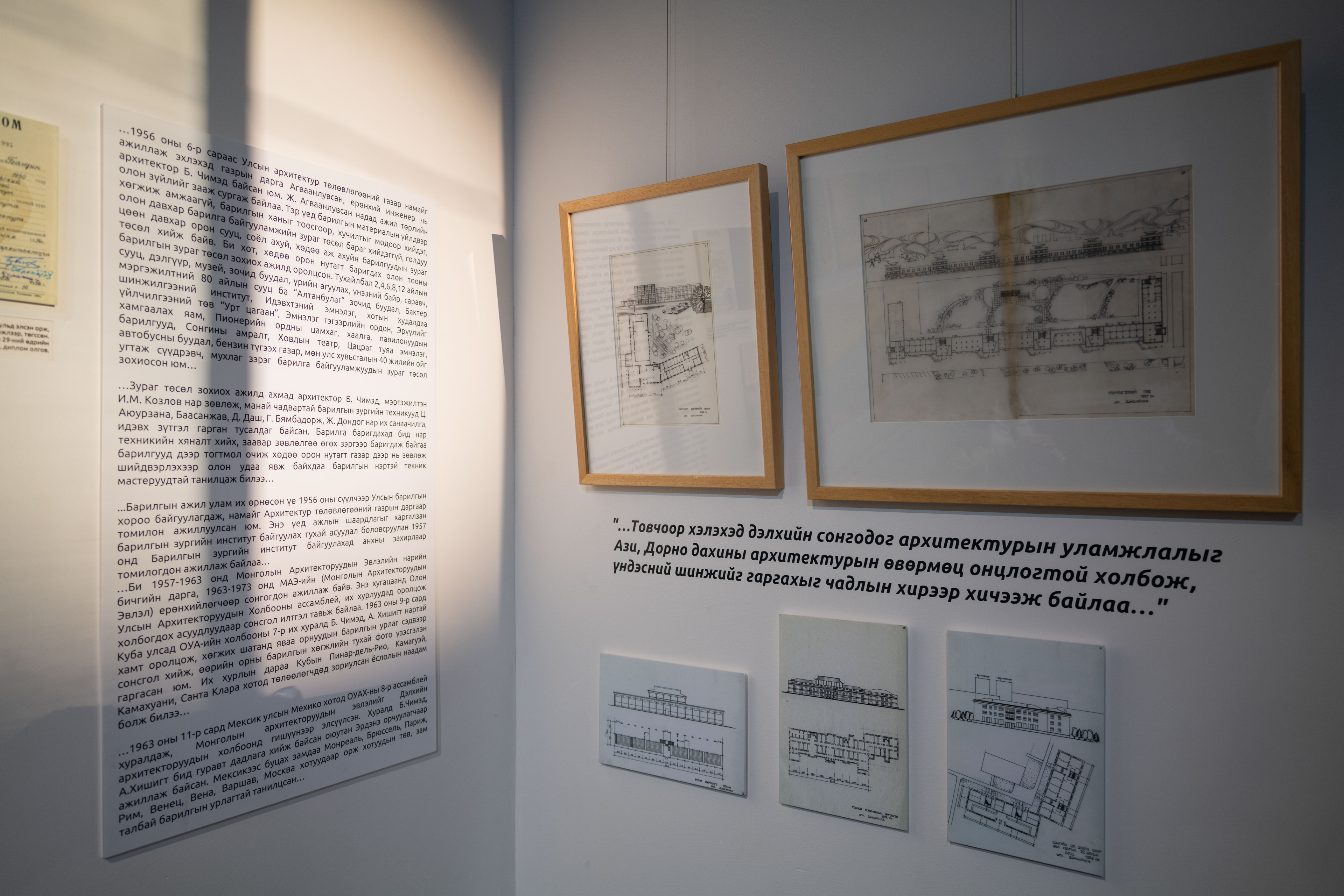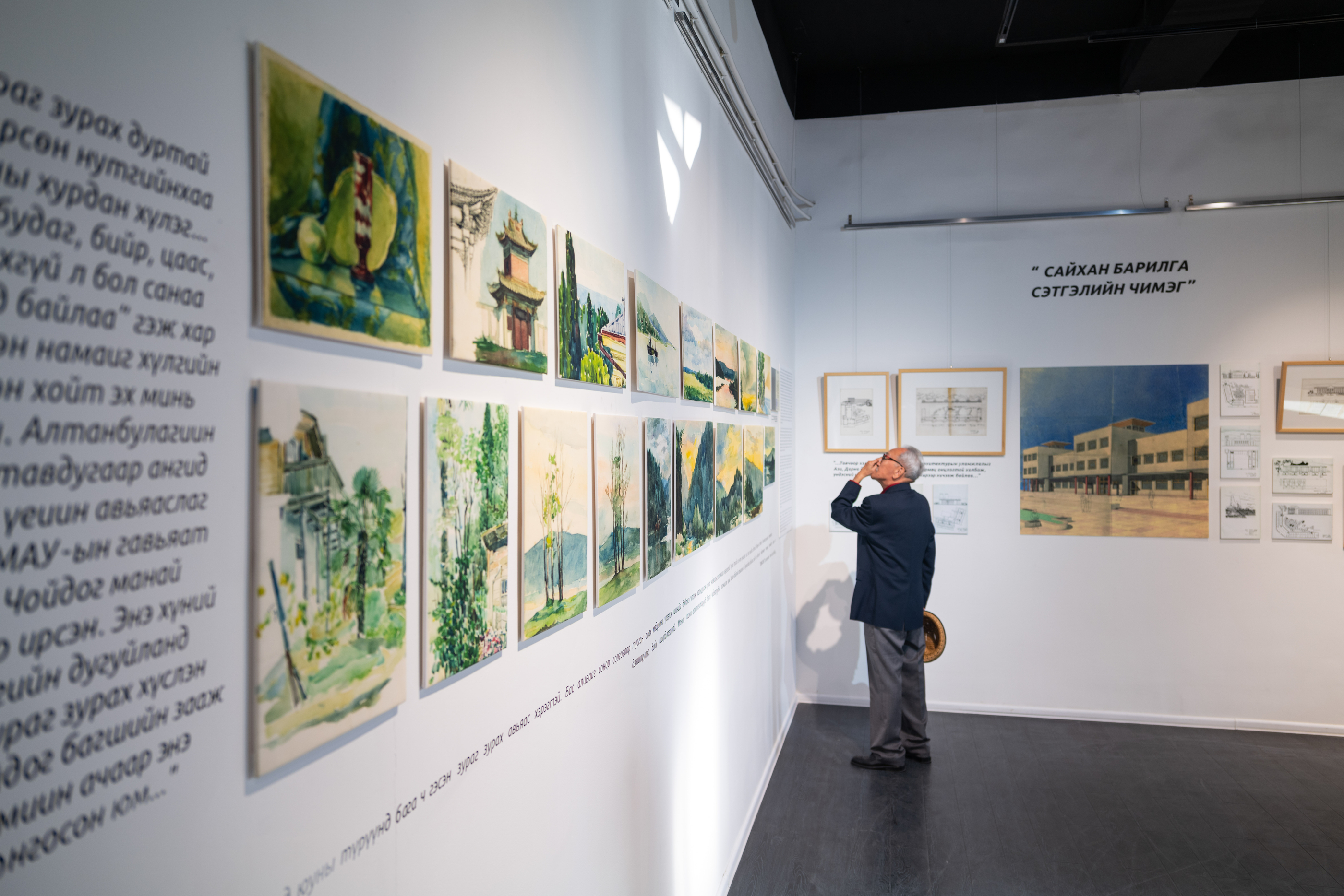 Үзэсгэлэнгийн хувьд манай ууган архитекторуудын нэг, Монгол Улсын хоёр дахь архитектор Бандийн Дамбийням гуайн мэндэлсний 100 жилийн ойг тохиолдуулж гаргаж буйгаараа онцлогтой. 1924 онд Буриадад төрөөд жаахан хүүхэд байхдаа тэрээр монголд ирсэн гэдэг. Б.Дамбийням гуай бол 40, 50 жилийн турш энэ салбарт архитектор, багшаар ажилласан, мөн барилгын салбарт ч ажиллаж явсан гавьяатай хүн юм. Энэ хүний 100 жилийн ойг тохиолдуулж амьдралынх нь дурсамж дурдатгалыг багтаасан ном гаргасан. Номын хажуугаар заавал үзэсгэлэн байх хэрэгтэй гэж үзсэний үндсэн дээр бид тус үзэсгэлэнг дэглэж зохион байгуулж байна. Номын тухайд түүний өөрийн бичиж үлдээсэн намтар тэмдэглэл, охин Д.Энэрэл болон найз нөхөд, хамаатан садных нь дурсамж, үзэсгэлэнд гарсан бүх зураг, хөрөг багтсан ийм баялаг ном болж чадсан.